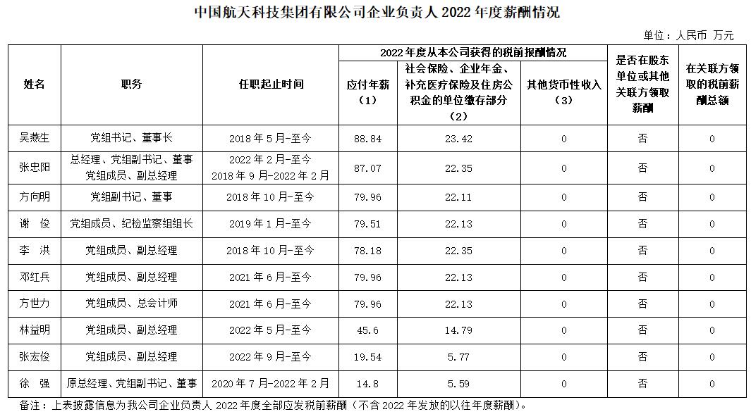 中国航天科技集团有限公司企业负责人2022年度薪酬情况