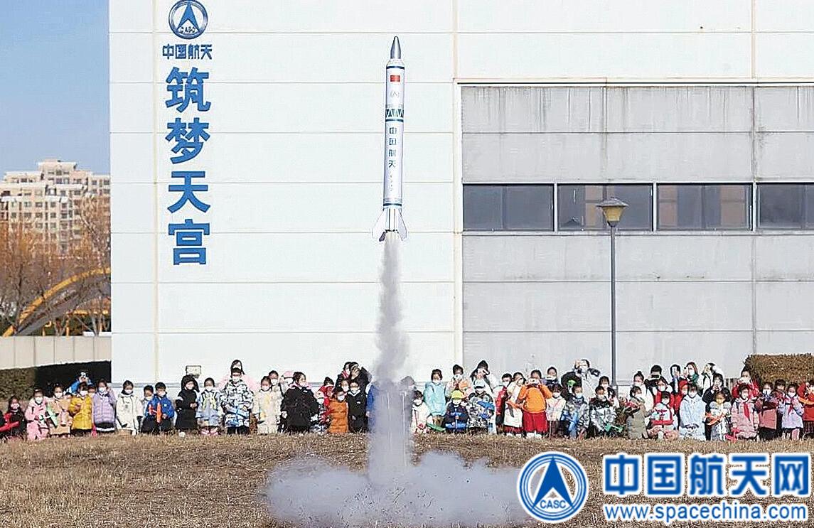 图为在火箭模型发射环节,参加活动的孩子们为火箭的顺利升空大声欢呼。五院供图