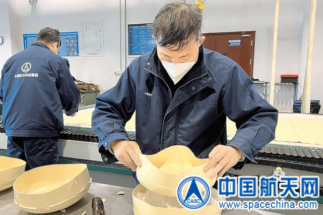 图为该所操作人员正在进行绝热层预制件成型。 周竑 摄