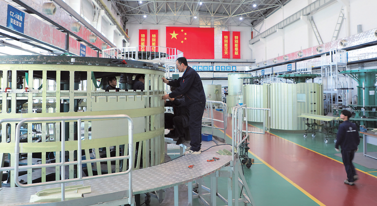 图为该所生产人员正在开展运载火箭铆接舱段的结构装配。王海晶 摄