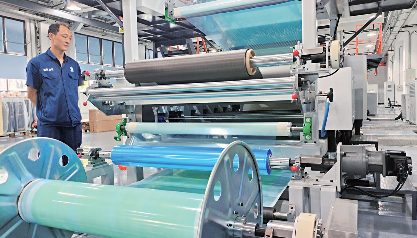 图为操作人员通过1300毫米热熔法预浸料生产设备制备高强碳纤维/环氧热熔法预浸料。毕华阳 摄