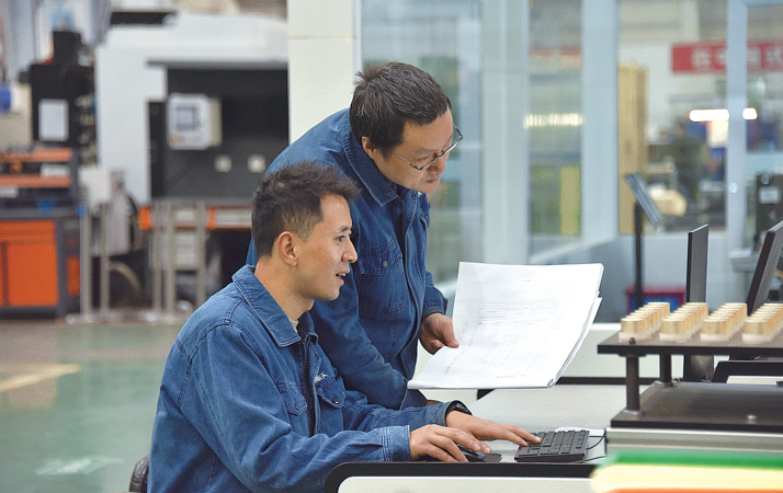 图为车间产线组员工正在调试小回转体单元。梁玲 摄